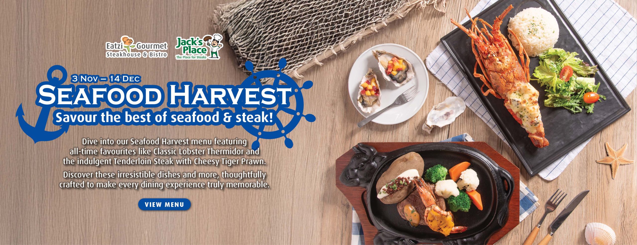 Promotions Jack's Place Seafood Harvest 3 Nov to 14 Dec 2025 Eatzi Gourmet Steakhouse Seafood Harvest 3 Nov to 14 Dec 2025 Jack's Place Striploin Steak & Slipper Lobster Every Mon from 5pm @ Selected Outlets Eatzi Gourmet Steakhouse Striploin Steak & Slipper Lobster Every Mon from 5pm Jack's Place 2 FOR $42 Dine-in Special Every Tue @ Selected Outlets Eatzi Gourmet Steakhouse 2 FOR $42 Dine-in Special Every Tue Jack's Place N.Z. Ribeye Steak Night Selected Days from 5pm Eatzi Gourmet Steakhouse N.Z. Ribeye Steak Night Every Wed from 5pm View More Promotions… e-Stores JP PepperdineGourmet Store Eatzi GourmetBakery JP PepperdineGift Vouchers flavours online(e-news) Eatzi GourmetCatering