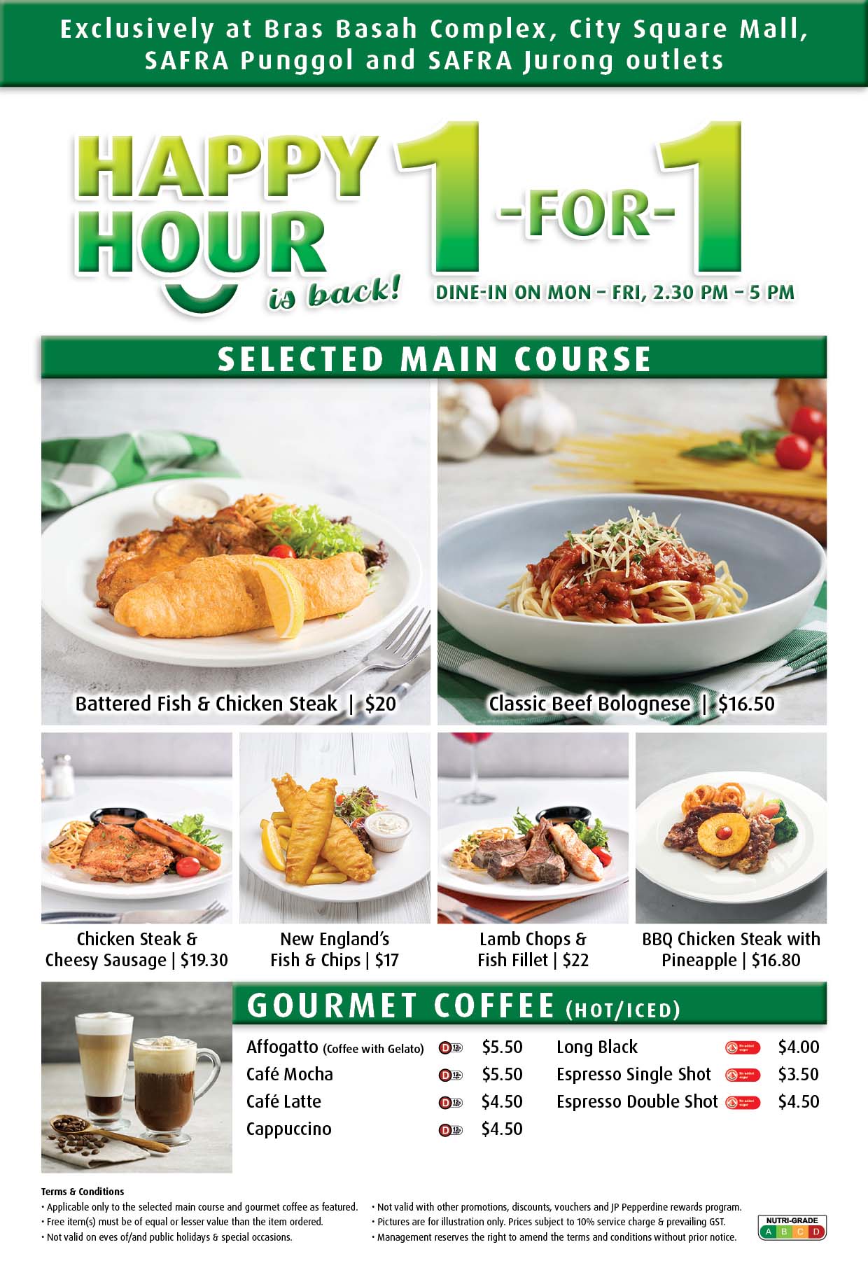 Happy Hour is back! Enjoy 1-FOR-1 on selected main courses and gourmet coffee when you dine in from Mon–Fri, 2.30PM – 5PM.
