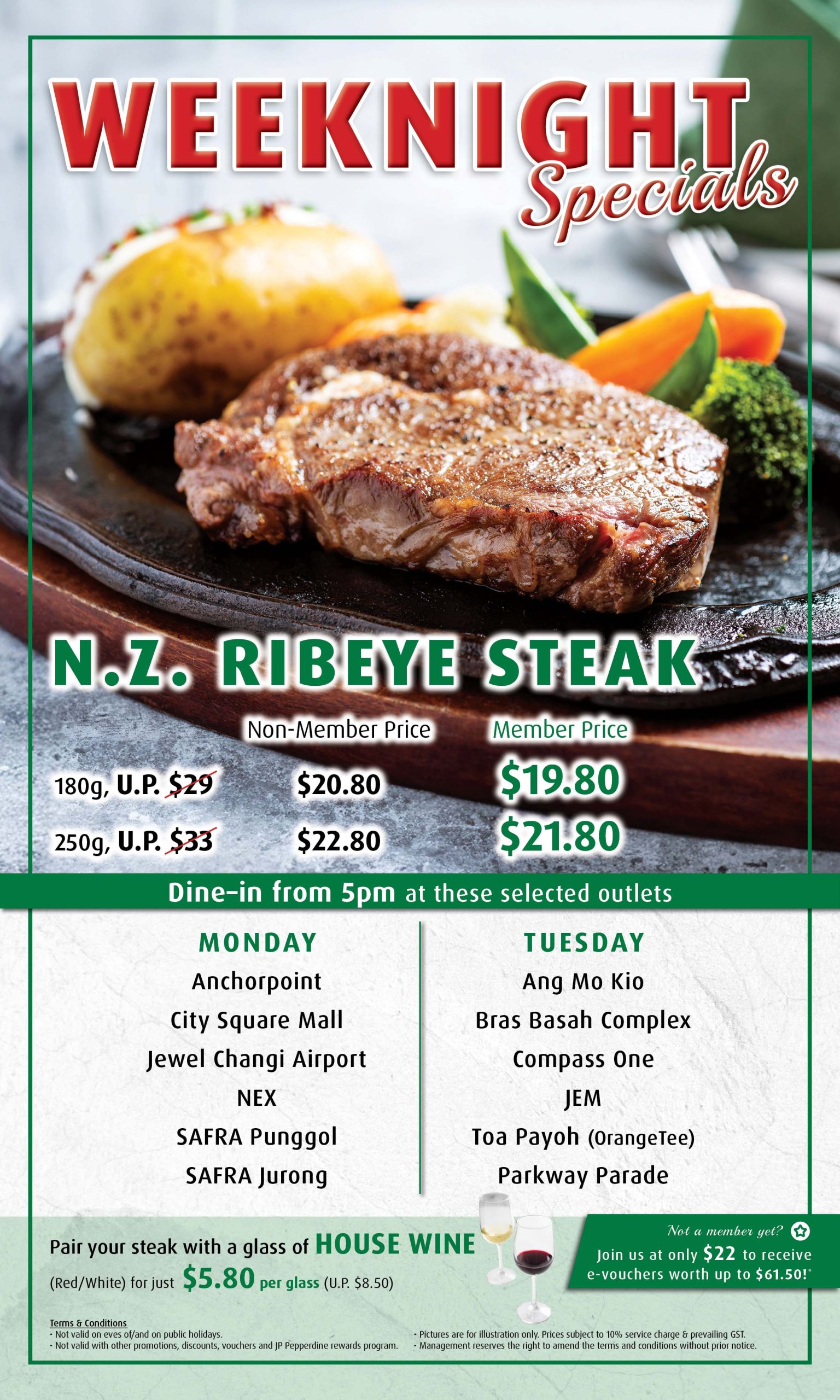 Pair your steak with a glass of House Wine (Red or White) for just $5.80 per glass (U.P. $8.50)