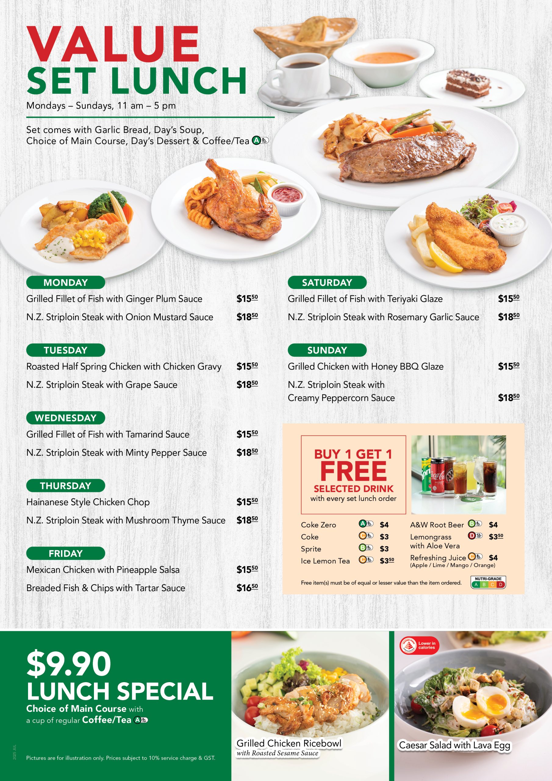 With our daily change of main course options, you can enjoy dishes such as N.Z. Striploin Steak, Fish or Chicken Set Lunches.