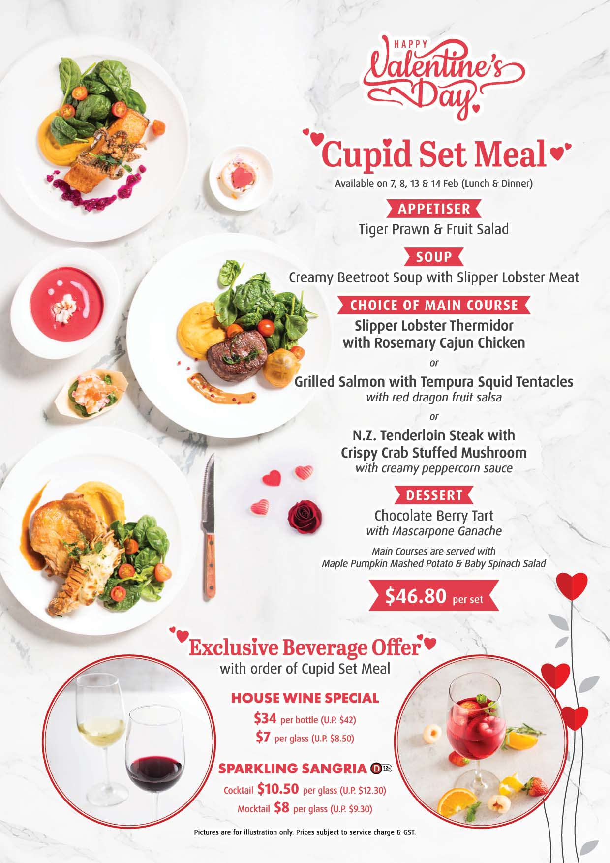 For just $46.80 per set, our Cupid Set Meal comes with an Appetiser, Soup, choice of Main Course and a delightful Dessert for a sweet ending.